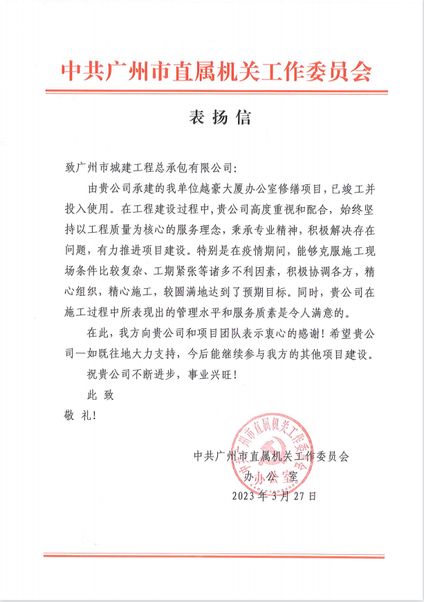 近日,中共广州市直属机关工作委员会向公司发来感谢信,为公司在克服施工条件复杂、工期紧张的情况下,顺利完成市直机关办公场所修缮项目表示肯定,并对公司及项目团队表示衷心的感谢。